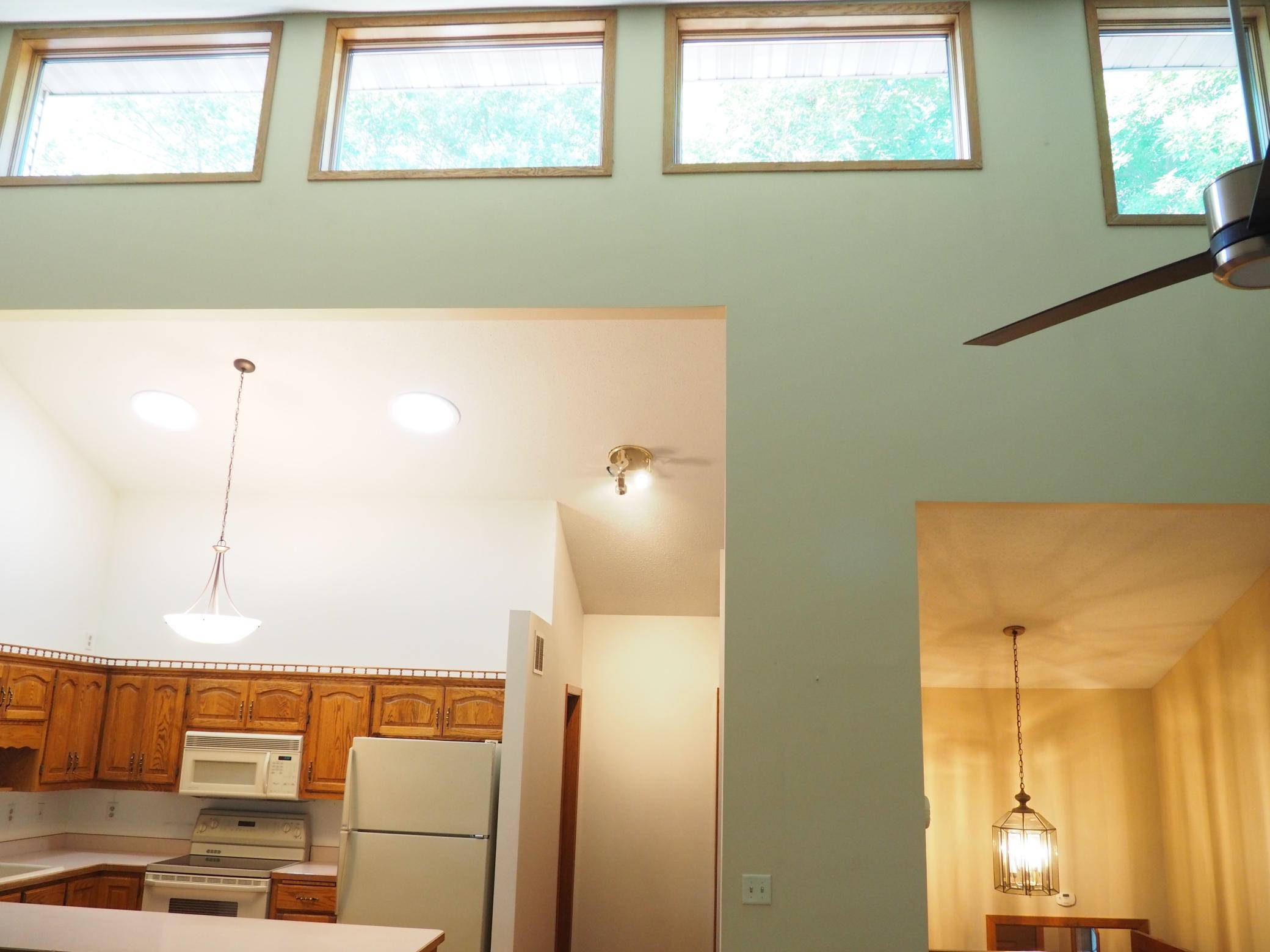 Enclosed porch overlooks treed and spacious greenspace with pond, and all this while being minutes from easy freeway access along with all sorts of restaurant, shopping and recreational options! Vaulted and bright is what you first sense when getting to the main living area. Next is all the counter and storage space on the main level. All awaits your design and updating ideas!!!