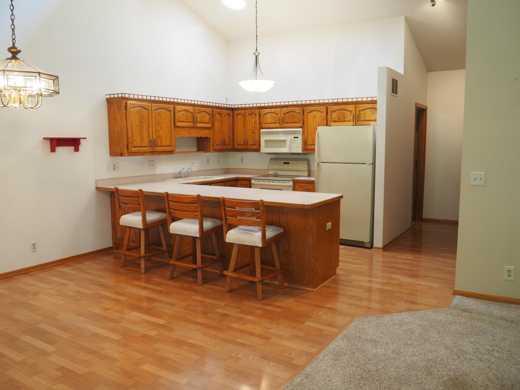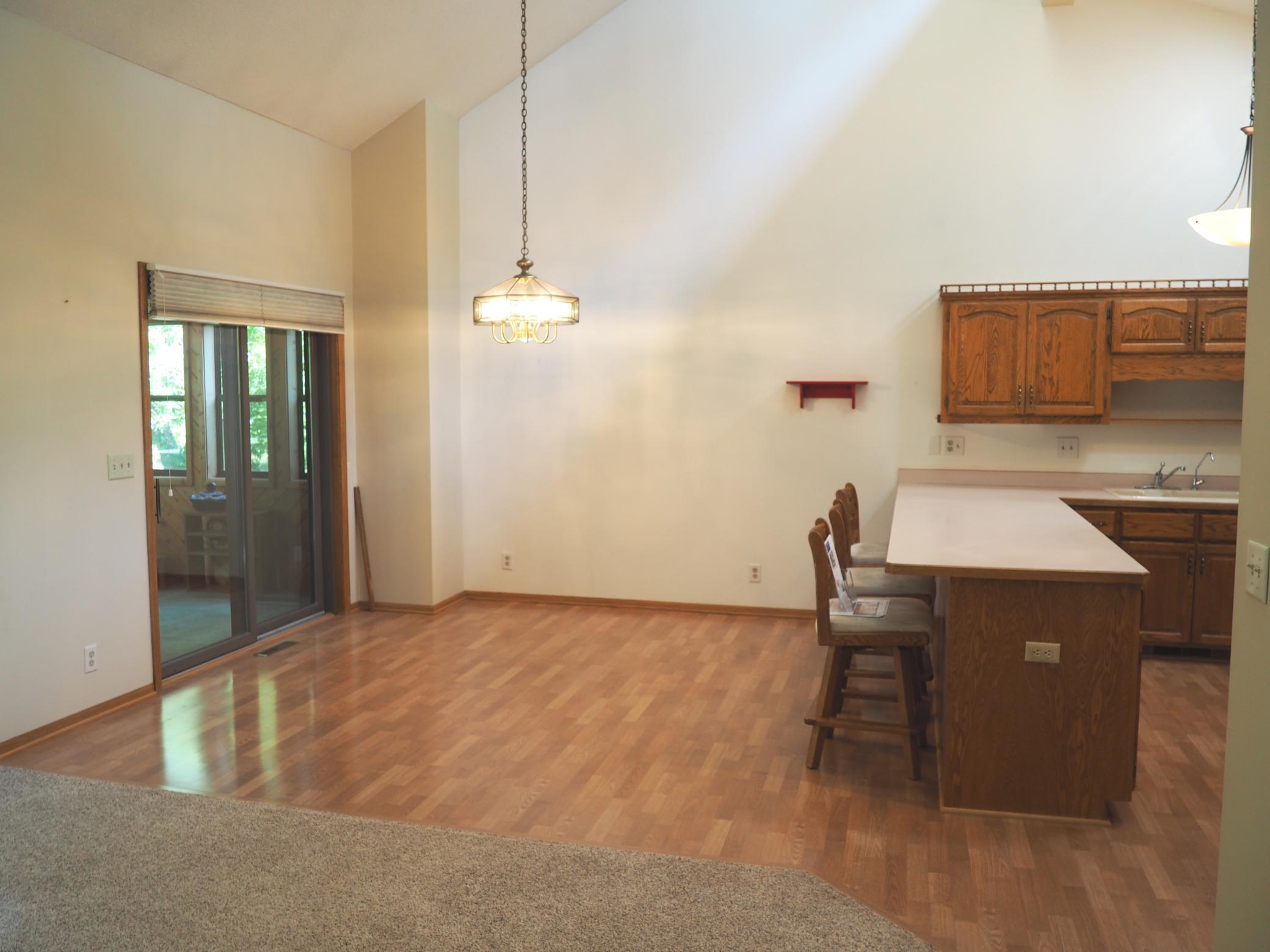 BACK ON THE MARKET due to financing falling thru. Empty and ready to move in and call HOME!!! All you need is on main level with BR, Bath, huge kitchen, laundry & enclosed porch overlooking large yard & pond. End unit townhome with two good sized bedrooms, two baths and an open/bright main floor living space. Numerous upgrades including furnace, central air and water softener (rented). Oversized pantry and numerous closets offer an abundance of storage space. Enclosed porch overlooks treed and spacious greenspace with pond, and all this while being minutes from easy freeway access along with all sorts of restaurant, shopping and recreational options! Vaulted and bright is what you first sense when getting to the main living area. Next is all the counter and storage space on the main level. All awaits your design and updating ideas!!! Small/well run association, convenient store and biking/walking trails very near as well as other shops and restaurants close too...