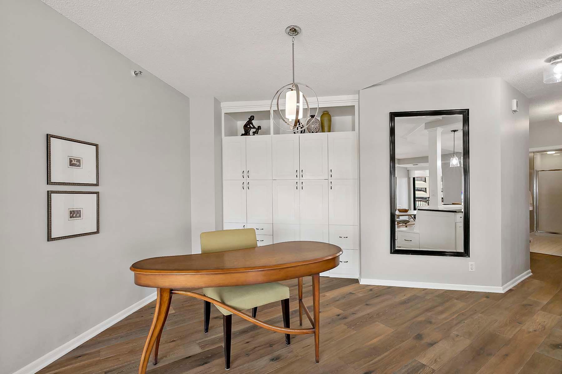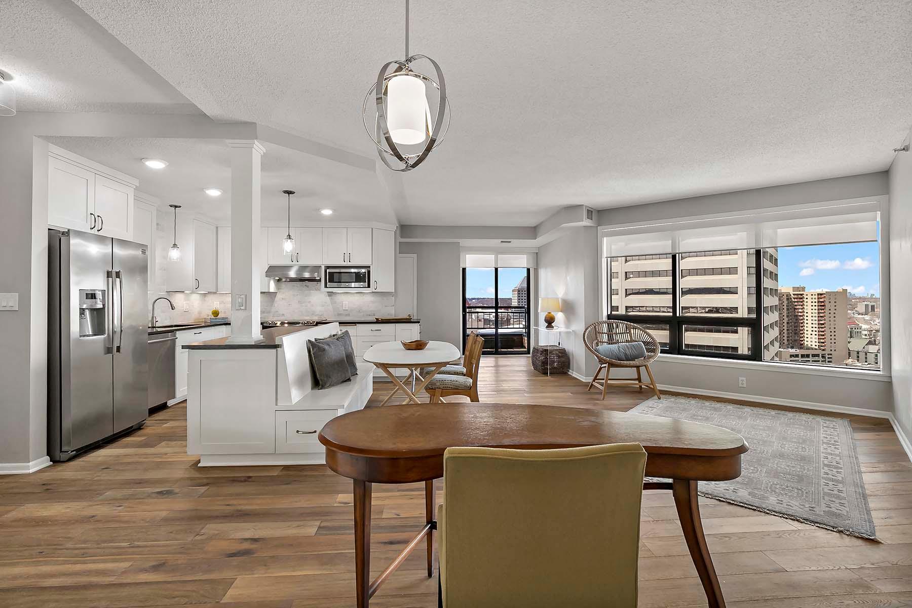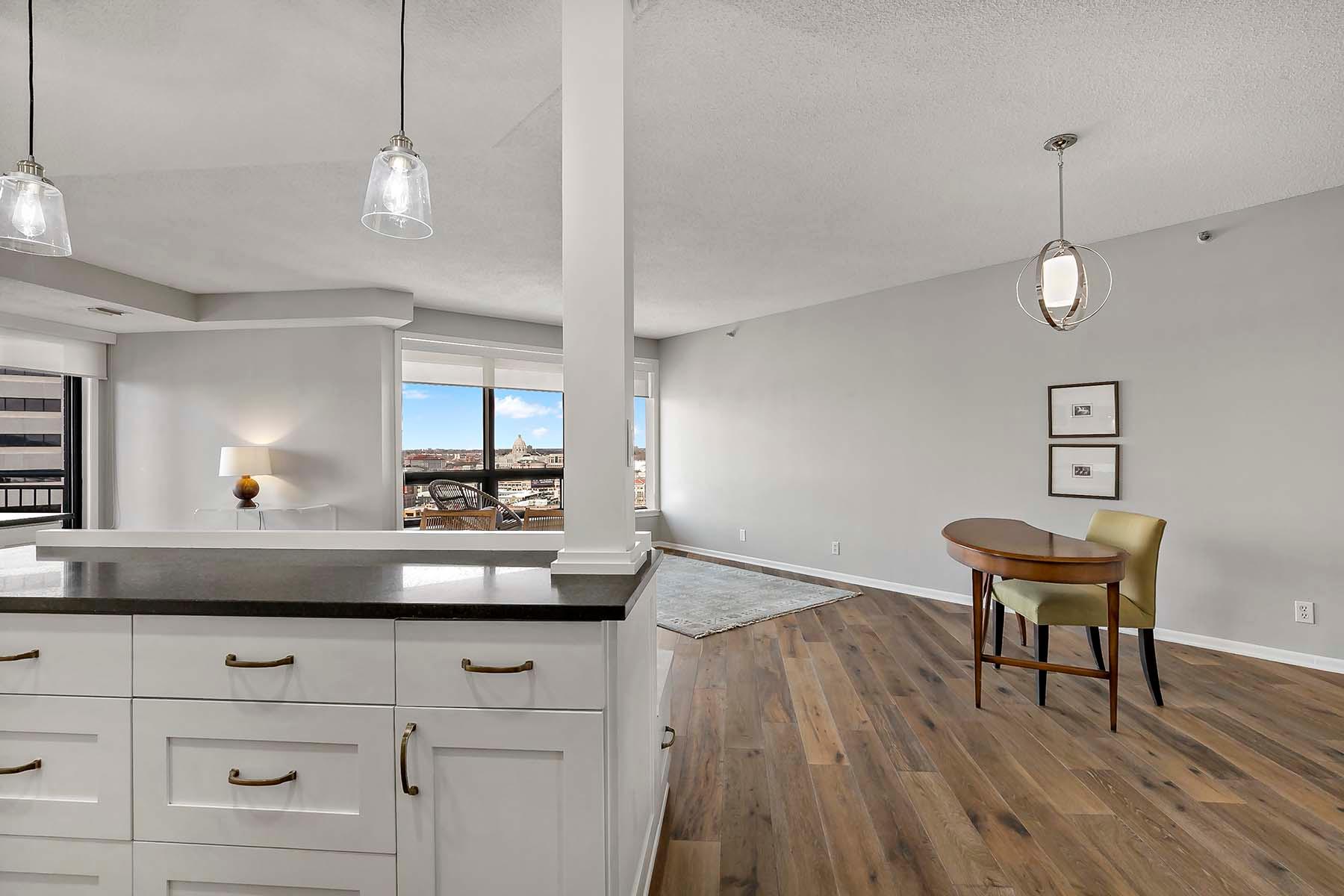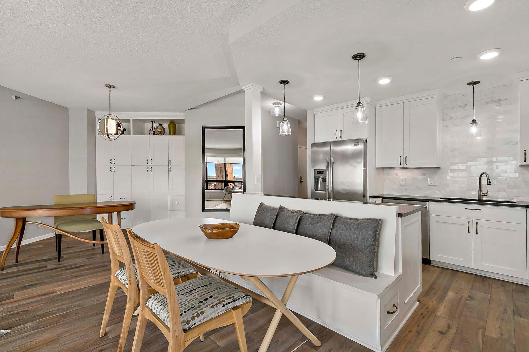 The Airye in Lowertown. Carefully designed and beautifully renovated. Designer features throughout. Custom kitchen cabinetry, built-in office, and all Container Store closets. Entry features in mahogany. The dining room & banquette can seat at least 8. Balcony overlooking the State Capitol. Airye has approved a major common area renovation of all lobbies, and the sellers will pay the assessment before closing. Owned storage unit, owned garage stall. Dues include heat+AC+internet+ cable+water. Community room. Excellent on-site management. Non-smoking building.The Airye is right ON THE SKYWAY to all downtown, even the Ordway and Wild games. Just 1 to 3 blocks to: Mears Park, Farmer's Market, Union Depot, CHS ballfield events, artist lofts, dozens of Lowertown restaurants. Owners pay for electricity (including for the HVAC fan). Otherwise, costs are taken care of in the association dues. Heat & cooling comes from District Energy, a central downtown source.