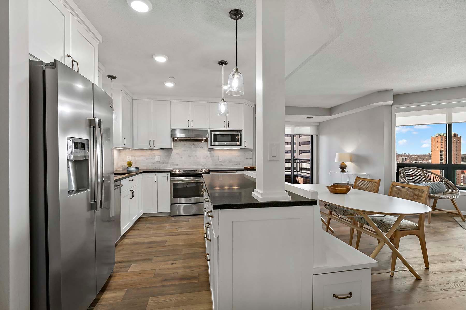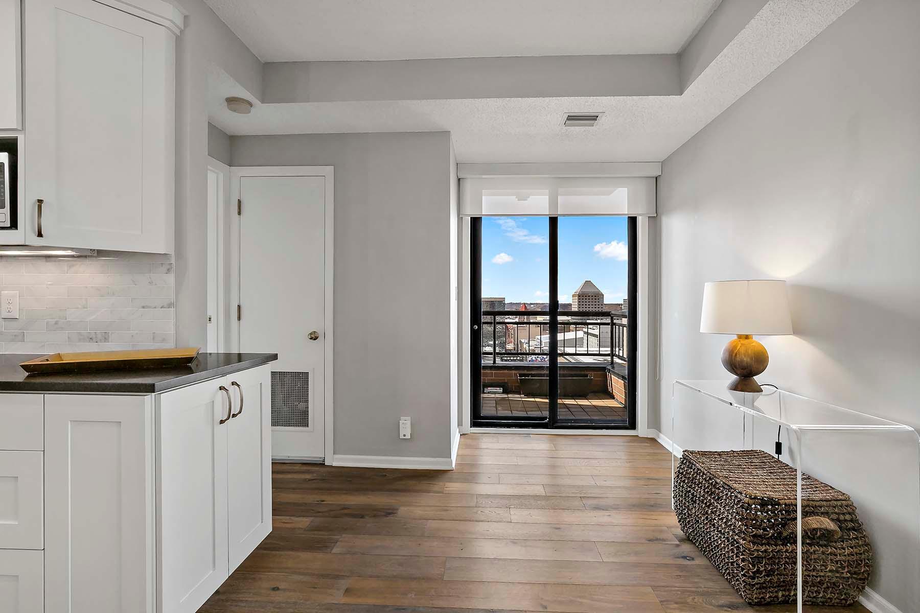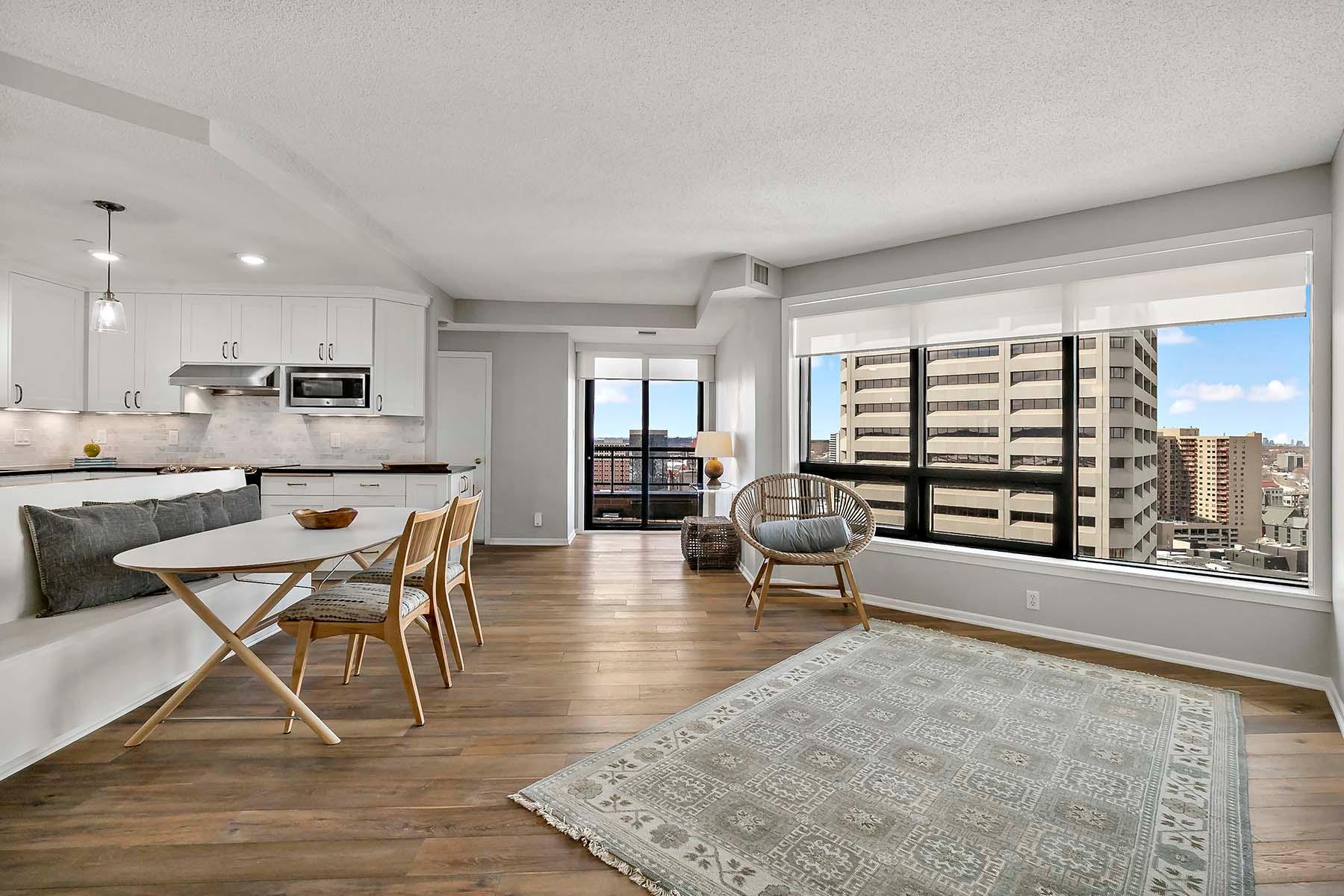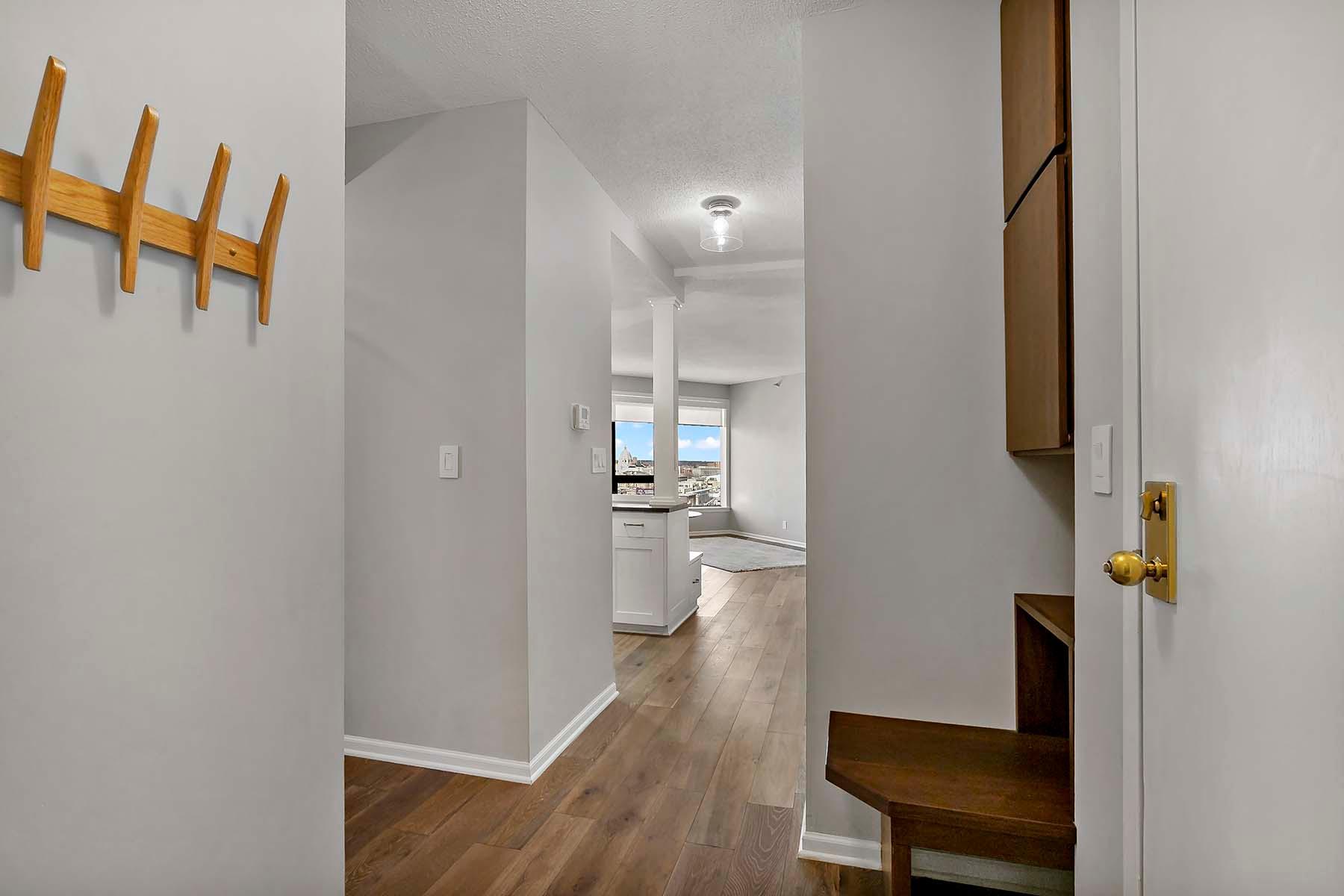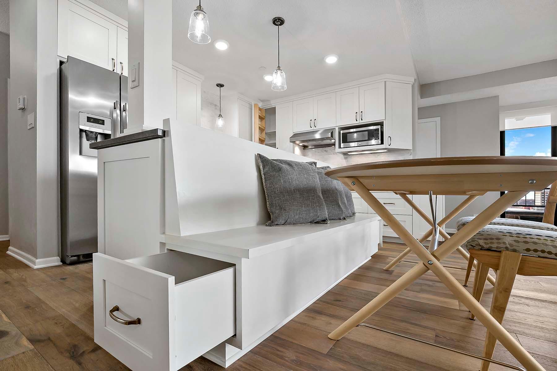 The Airye in Lowertown. Carefully designed and beautifully renovated. Designer features throughout. Custom kitchen cabinetry, built-in office, and all Container Store closets. Entry features in mahogany. The dining room & banquette can seat at least 8. Balcony overlooking the State Capitol. Airye has approved a major common area renovation of all lobbies, and the sellers will pay the assessment before closing. Owned storage unit, owned garage stall. Dues include heat+AC+internet+ cable+water. Community room. Excellent on-site management. Non-smoking building.The Airye is right ON THE SKYWAY to all downtown, even the Ordway and Wild games. Just 1 to 3 blocks to: Mears Park, Farmer's Market, Union Depot, CHS ballfield events, artist lofts, dozens of Lowertown restaurants. Owners pay for electricity (including for the HVAC fan). Otherwise, costs are taken care of in the association dues. Heat & cooling comes from District Energy, a central downtown source.