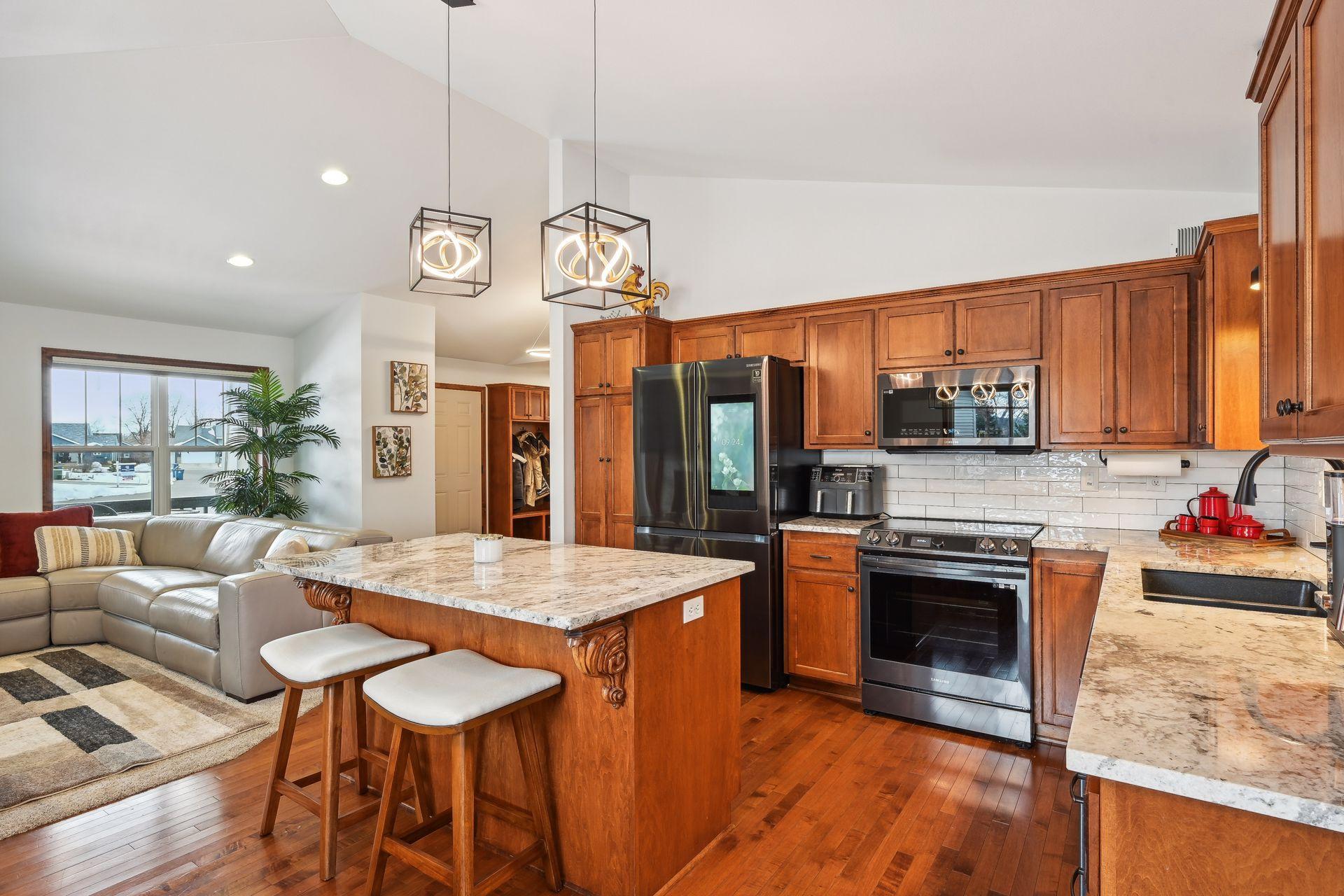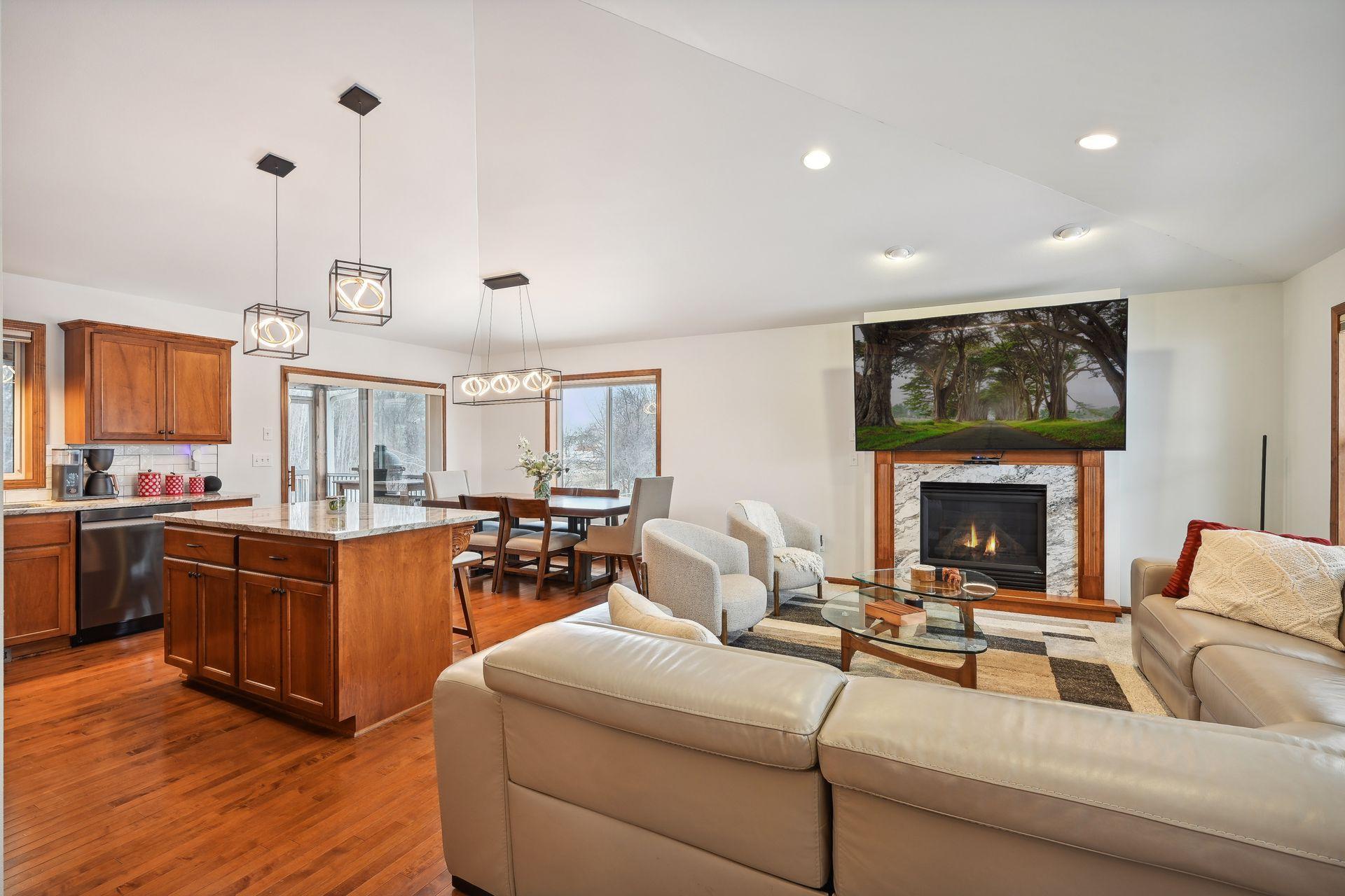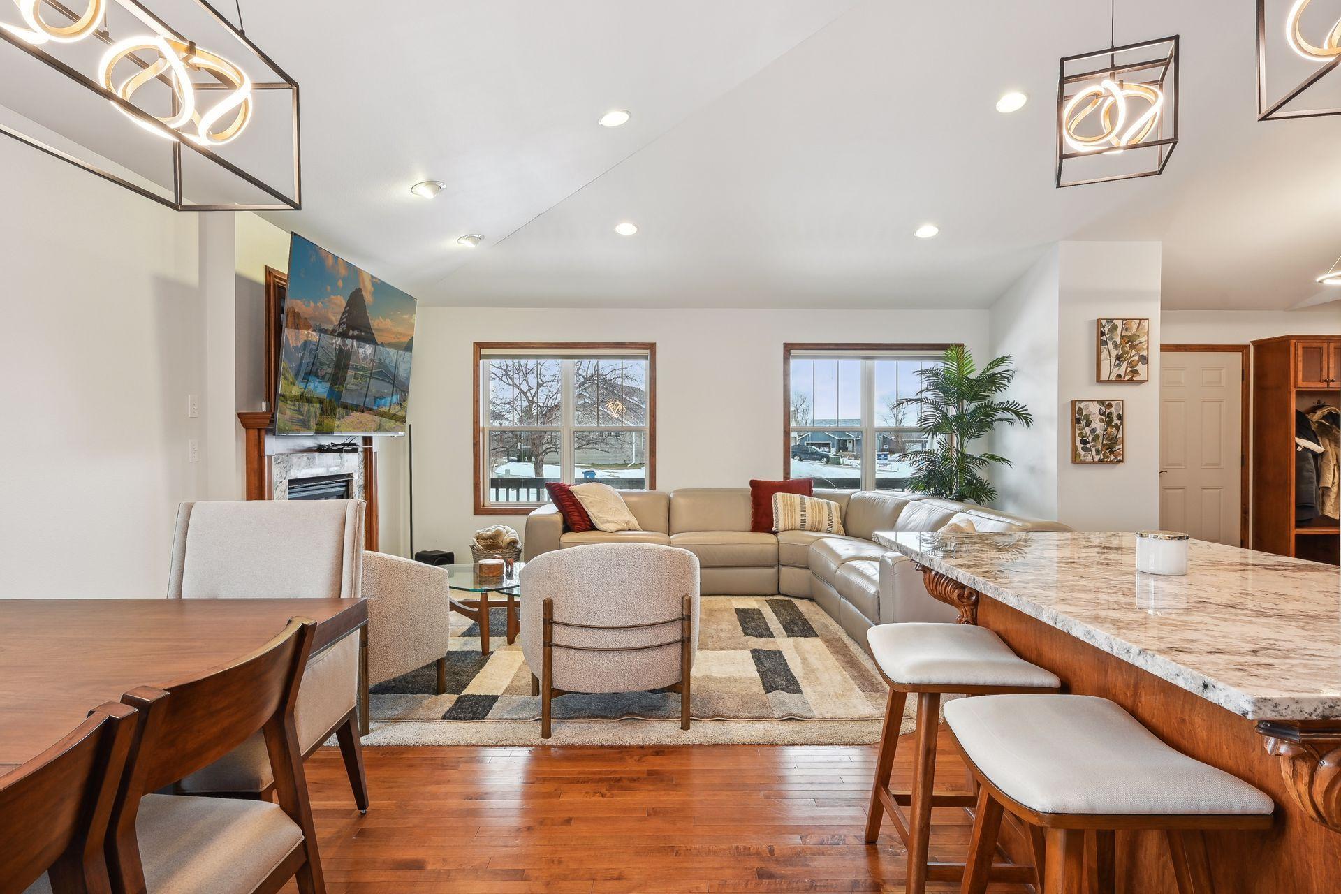 Every inch of this home has been upgraded! The exterior has been accented by Black windows, garage doors, and railing, making the curb appeal pop! With a vaulted ceiling, the open concept main floor feels large and inviting. Even the window treatments are remote controlled! Granite counters, high end SS appliances, and a beautiful tile backsplash make this kitchen a pleasure to prepare meals in. The primary bedroom is equipped with a private bathroom that features a fully tiled walk-in shower, tiled floors, and separate tub for relaxing your troubles away. Stay warm on cold winter nights by curling up to the glow of either of the two gas burning fireplaces. On hot summer nights, watch the sunset with a cool drink in hand as you overlook your fully fenced back yard from the privacy of your wood paneled 3 season porch! Don't miss the dream garage! Fully finished, heated, professionally epoxied, with privacy windows on the garage doors! You may never go inside the house again!