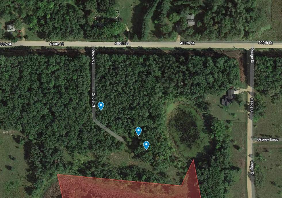 Directions: 400th Street to Oriole court to end, cul-de-sac.